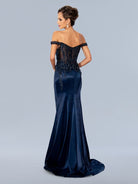 slim-flare evening dress showcases beaded floral appliques, an off-the-shoulder sweetheart neckline, corset bodice, and sheer V-back. The formal gown is secured with a zip closure, boasts a horsehair hem, and is elegantly completed with a sweep train. (available Navy or Teal sizes 6-20)